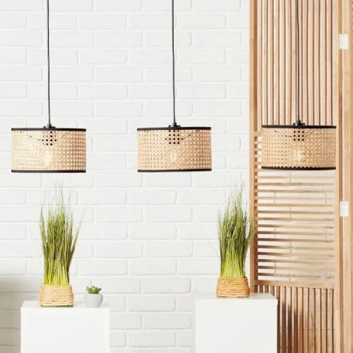 Cette suspension au style ethnique est composée d’une rosace de plafond en métal, de câbles d’alimentation distribuant trois abat-jour cylindriques fabriqués en rotin naturel.
