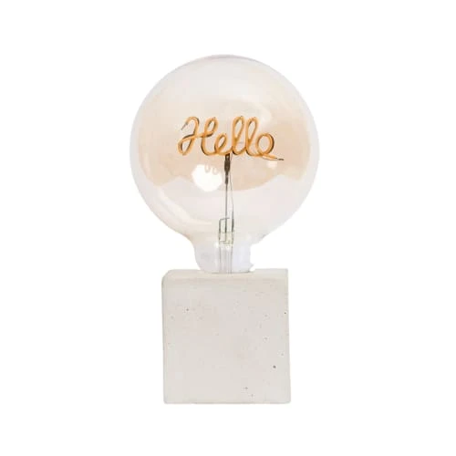Nous l’adorons pour son socle en béton coloré en forme de cube et son ampoule à message « Hello » qui viendra illuminer votre intérieur. Une ampoule à filaments LED volumineuse, au message rempli de bonheur qui vous donnera le sourire !
