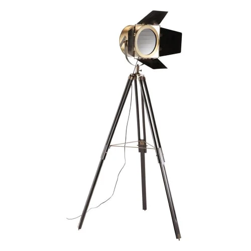 Ce lampadaire en métal prend la forme d’un projecteur monté sur un trépied en métal finition cuivrée.