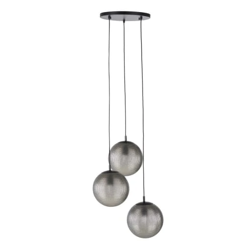Le style contemporain s’invite chez vous avec la suspension triple en verre fumé irisé et métal noir CHATILLON. Avec trois abat-jours boules en verre soufflé tombant à hauteurs différentes, cette lampe à suspendre