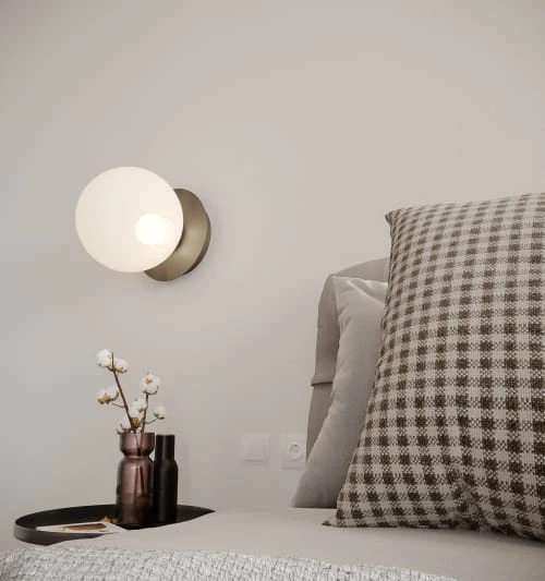 Le talent de la lampe à applique murale Enna est d’offrir de belles mises en scène décoratives. Sa monture de coloris or et son globe en verre opaque blanc la prédisposent d’emblée aux ambiances élégantes, axées sur les détails luxueux inspirés des Années folles. Objet déco raffiné, cette applique design, même éteinte, est capable de rythmer les murs de façon attrayante. À la nuit tombée, l’applique murale dorée propose un éclairage délicat, diffusé en douceur. Enna peut se fixer seule ou en paire, encadrer une étagère, installer une atmosphère cosy dans un coin canapé.