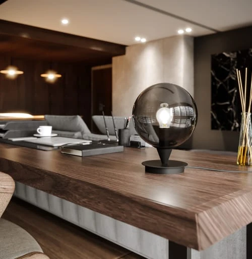 La lampe en métal et verre Avola a le profil du superbe luminaire d’intérieur design qui se place aussi naturellement dans un salon, une salle à manger, que dans une chambre ou un bureau. Avec sa sphère de verre fumé qui délivre une bulle de lumière douce, les soirées deviennent chics et réconfortantes. Notre conseil déco : équipez la lampe à poser Avola d’une ampoule à filament et donnez-lui une place de choix, sur une console, un buffet ou une étagère. Elle sublimera un objet décoratif, par exemple une statuette, une corbeille en métal. Associez-la à sa sœur la lampe à poser design Noto. Vous décuplerez son look full black et l’effet de halo !