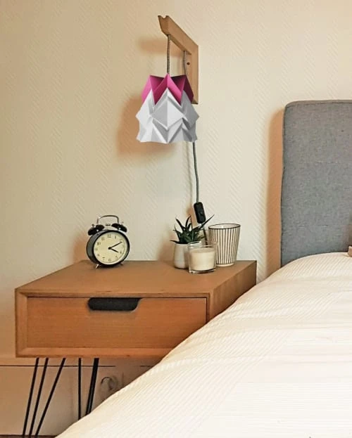 Nos produits sont fabriqués à partir de papier de haute qualité, sans acides, fabriqué en France avec des fibres végétales issues de la gestion responsable des forêts (label FSC®). Le papier, en tant que matériau hautement recyclable, s’inscrit parfaitement dans notre recherche de matériaux durables ! Pour cette raison notre papier n’est pas traité anti-feu ni imperméabilisé. Cela signifierait que le papier ne pourrait pas être recyclable à 100% et cela irait contre notre philosophie environnementale. Nous vous conseillons de choisir nos abat-jour uniquement pour les pièces intérieures et les pièces sèches. Et n’utilisez que des ampoules à LED. Vous recevrez le support en bois avec le câble textile prêt à être installé. L’abat-jour en origami est également déjà monté et prêt à être installé une fois le support installé au mur. Nos abat-jours sont conçus pour être utilisés avec une ampoule LED. Cette applique murale doit être utilisée exclusivement avec une ampoule à LED. Douille E27.L’ampoule n’est pas fournie. Nos lampes origami sont très faciles à nettoyer. Vous pouvez utiliser un plumeau ou de l’air comprimé mais à au moins 30 cm.